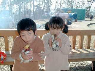 | ママが作ってくれた「おにぎり」をパクリ! 目の前では、遊具でみんな遊んでいるので 子供達はどちらかというと、食べるより 早く遊びたくてムズムズ。 |